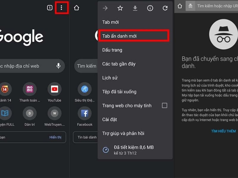 Hệ điều hành Android cho phép tích hợp nhiều trình duyệt khác nhau, mỗi ứng dụng đều có phương thức kích hoạt tab ẩn danh riêng biệt nhưng đều rất trực quan.