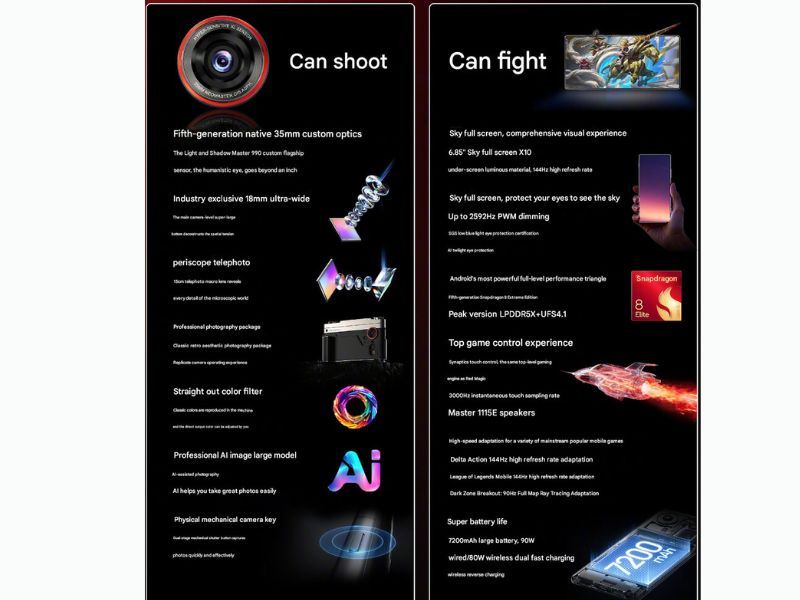 Về màn hình, Z80 Ultra sử dụng tấm nền AMOLED 6.85 inch, tần số quét 144Hz và công nghệ PWM dimming 2.592Hz, giúp giảm mỏi mắt khi sử dụng lâu dài. Thiết bị được trang bị chip Snapdragon 8 Elite Gen 5, kết hợp RAM LPDDR5X và bộ nhớ UFS 4.1, đảm bảo hiệu năng mạnh mẽ cho cả chơi game, quay phim và xử lý đa nhiệm.
